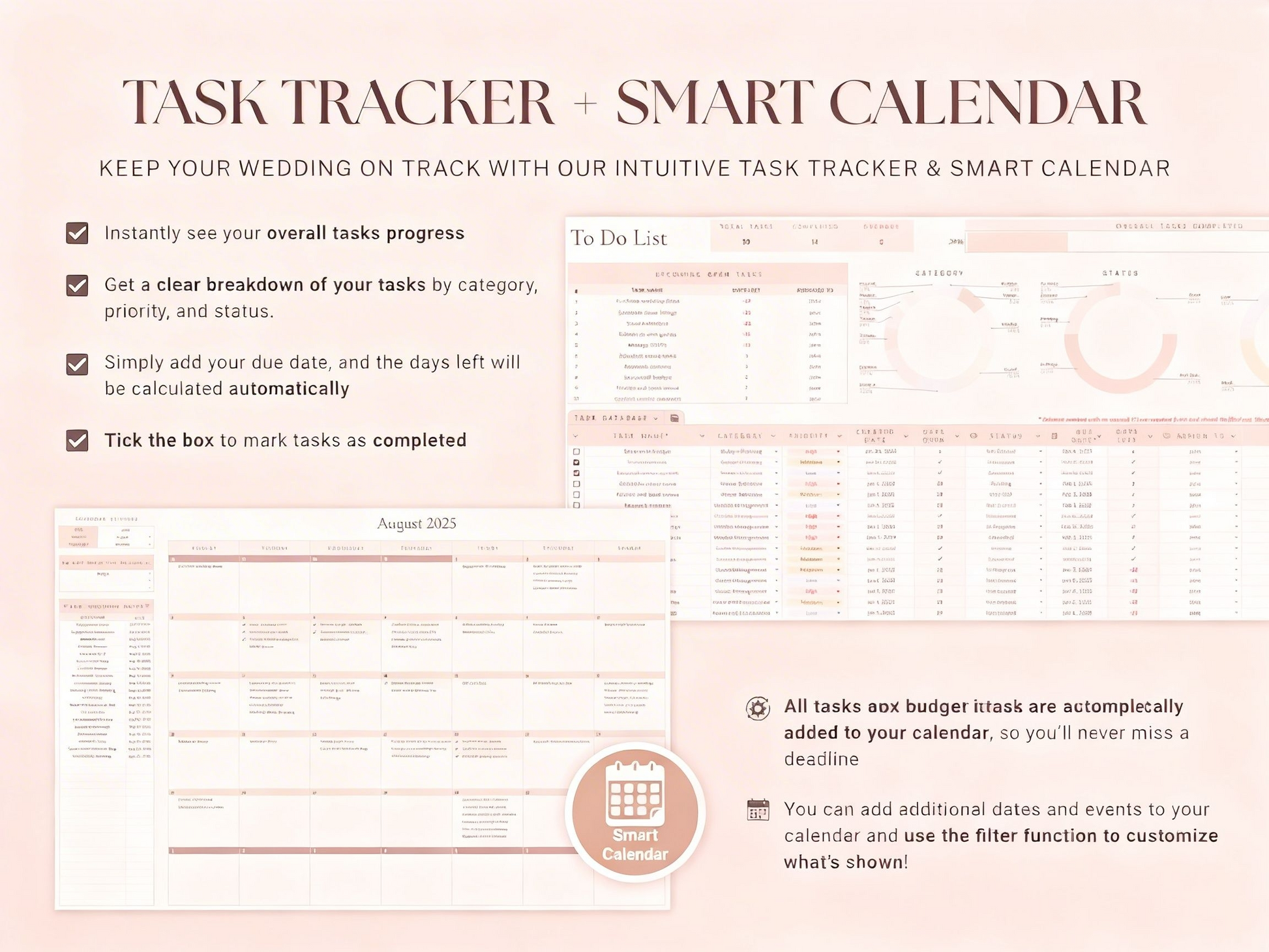 This Wedding Planner keeps your wedding date, vendors, guest list, ceremony venue and budget in one clean dashboard, so you can spend less time over details!
